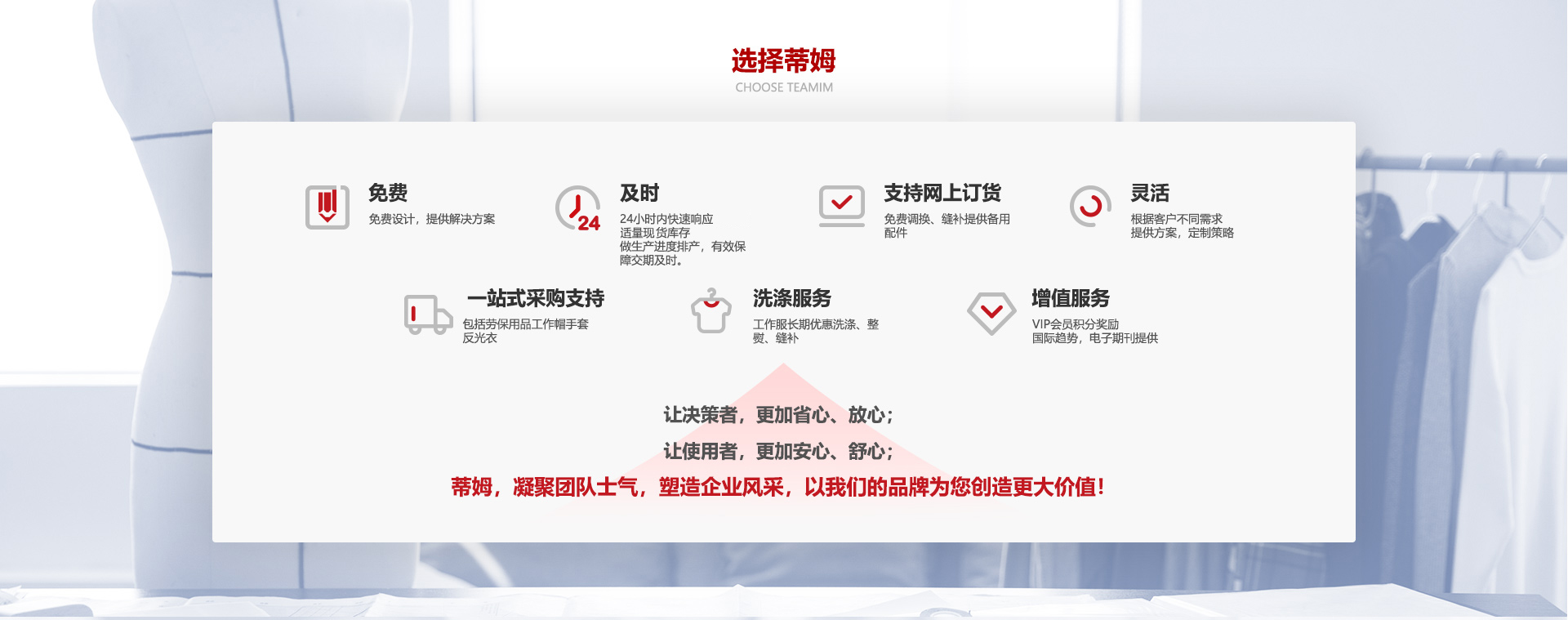 蒂姆服裝創立于1999年,已有20多年的歷史,集服裝服飾設計研發、生產制作、產品銷售+服務、技術提案、一站式采購支持于一體的國內為數不多的具備全價值鏈的專業制服供應商。公司嚴格按照ISO9001質量管理體系標準及五星級售后服務體系執行,專注于研究職業裝材料的健康性、舒適性、時尚性、安全性、科技性。塑造企業形象,展現企業風彩。